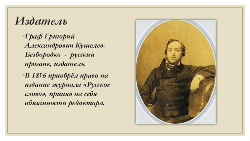 ИздательГраф Григорий Александрович Кушелев-Безбородко  - русский прозаик, издатель.В 1856 приобрёл право на издание журнала «Русское слово», приняв