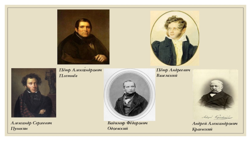 Пётр Андреевич ВяземскийАлександр Сергеевич ПушкинАндрей Александрович КраевскийВадимир Фёдорович ОдоевскийПётр Алекса́ндрович Плетнёв