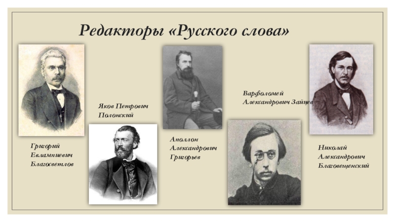 Редакторы «Русского слова»Григорий Евлампиевич БлагосветловЯков Петрович ПолонскийАполлон Александрович ГригорьевВарфоломей Александрович ЗайцевНиколай Александрович Благовещенский