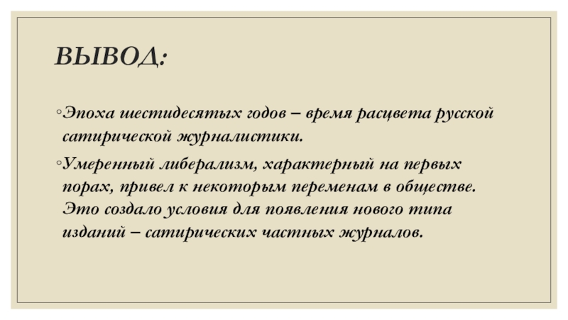 ВЫВОД:Эпоха шестидесятых годов – время расцвета русской сатирической журналистики.Умеренный либерализм, характерный на первых порах, привел к некоторым