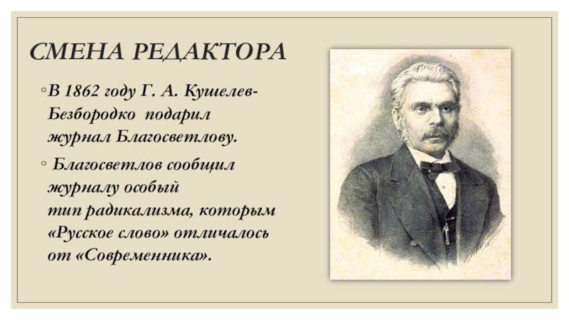 СМЕНА РЕДАКТОРАВ 1862 году Г. А. Кушелев-Безбородко  подарил журнал Благосветлову. Благосветлов сообщил журналу особый тип радикализма, которым «Русское