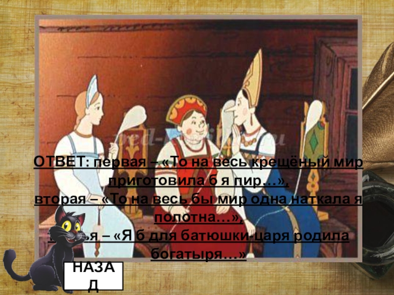 ОТВЕТ: первая – «То на весь крещёный мир приготовила б я пир…»,