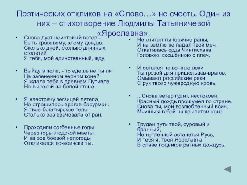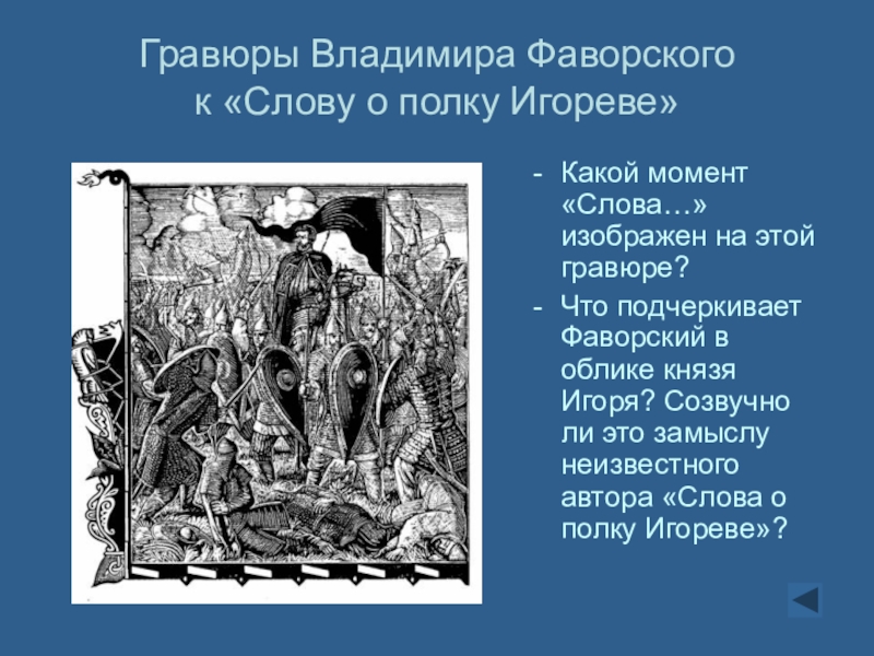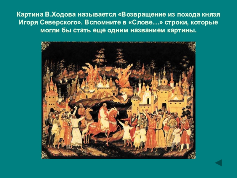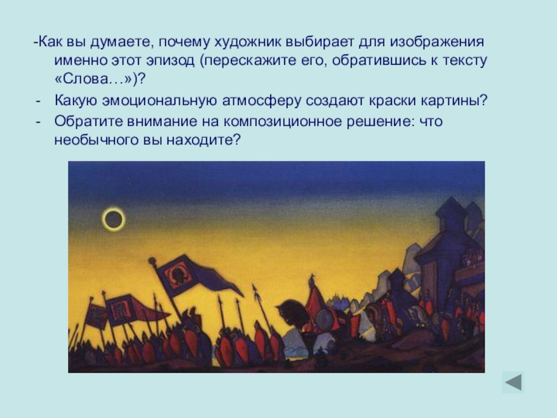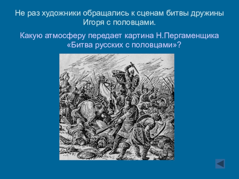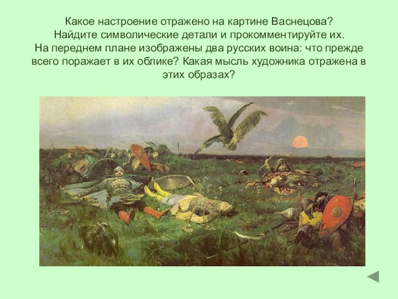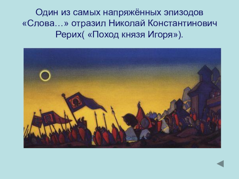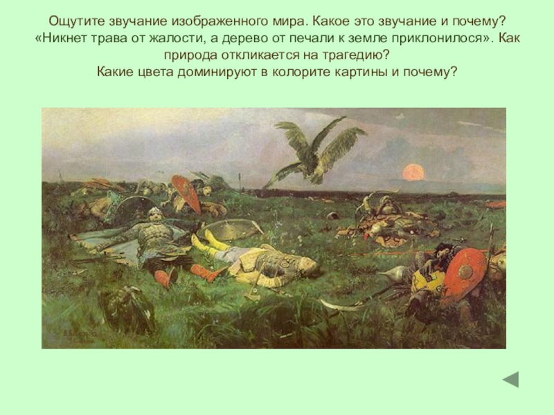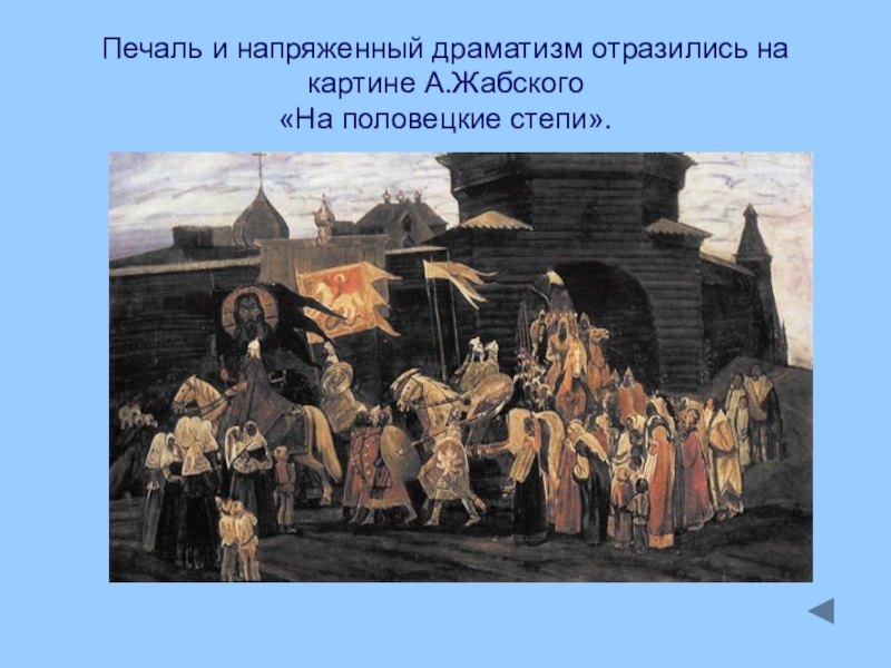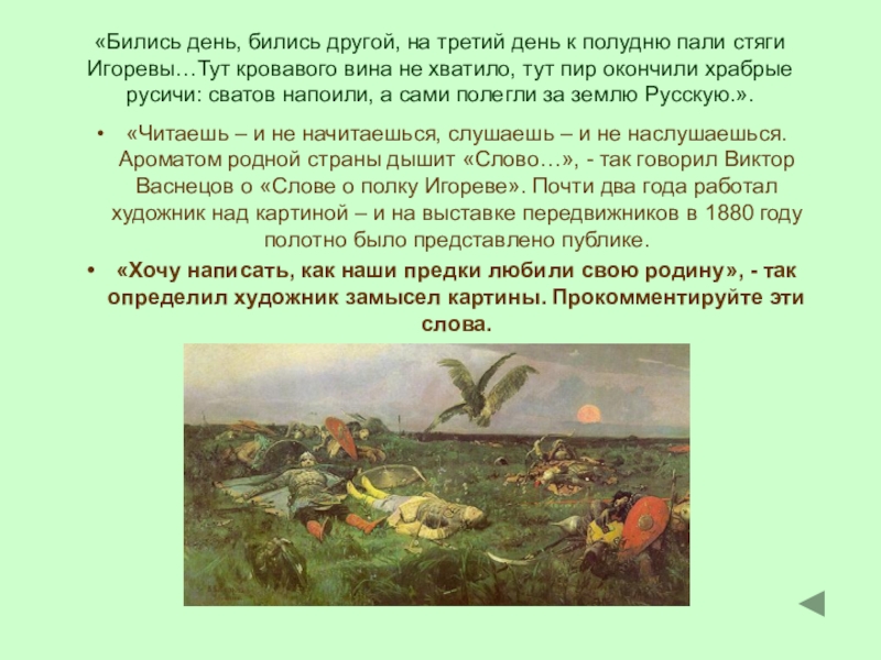 «Читаешь – и не начитаешься, слушаешь – и не наслушаешься. Ароматом родной страны дышит «Слово…», - так говорил Виктор Васнецов о «Слове о полку Игореве». Почти два года работал художник над картиной – и на выставке передвижников в 1880 году полотно было представлено публике.
