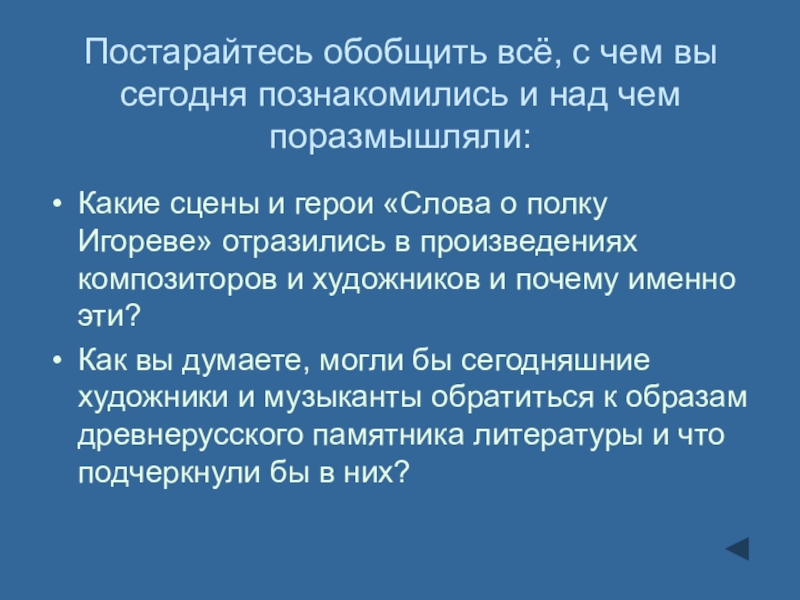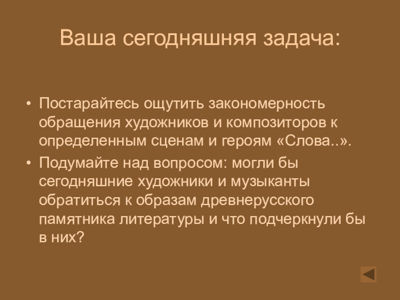 Как вы думаете, могли бы сегодняшние художники и музыканты обратиться к образам древнерусского памятника литературы и что подчеркнули бы в них?