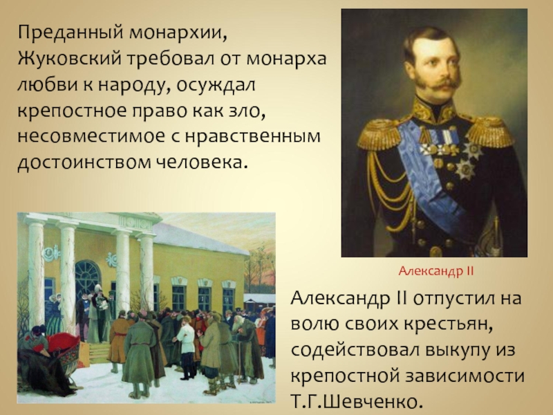 Александр II отпустил на волю своих крестьян, содействовал выкупу из крепостной зависимости Т.Г.Шевченко.