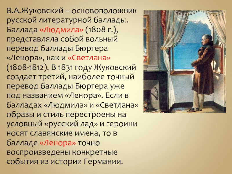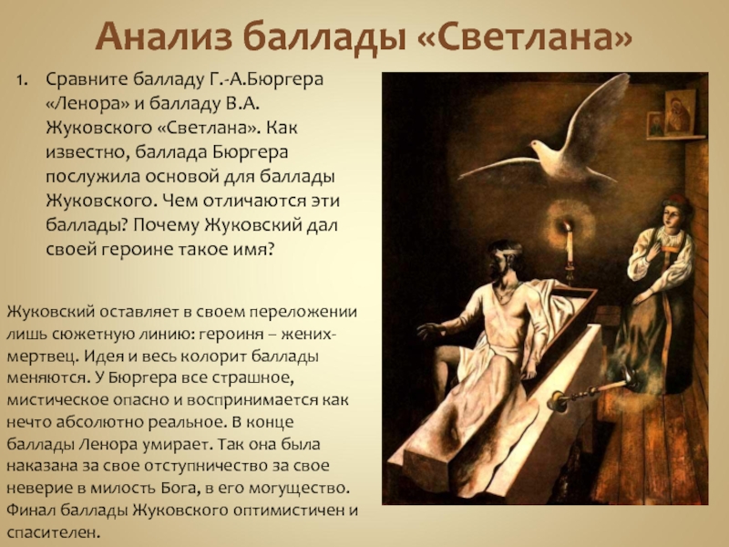 Жуковский оставляет в своем переложении лишь сюжетную линию: героиня – жених-мертвец. Идея и весь колорит баллады меняются. У Бюргера все страшное, мистическое опасно и воспринимается как нечто абсолютно реальное. В конце баллады Ленора умирает. Так она была наказана за свое отступничество за свое неверие в милость Бога, в его могущество. Финал баллады Жуковского оптимистичен и спасителен.
