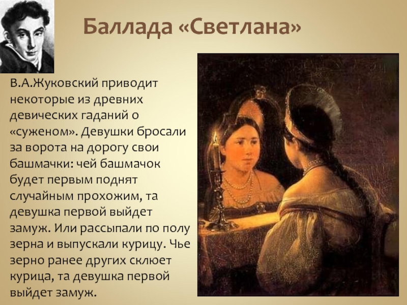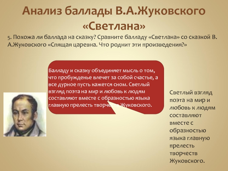 Балладу и сказку объединяет мысль о том, что пробужденье влечет за собой счастье, а все дурное пусть кажется сном. Светлый взгляд поэта на мир и любовь к людям составляют вместе с образностью языка главную прелесть творчеств Жуковского.