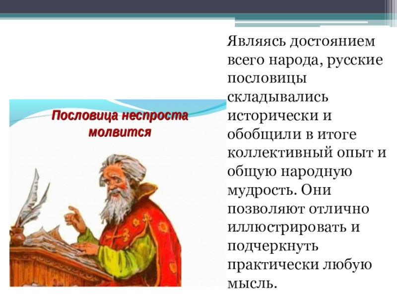 Являясь достоянием всего народа, русские пословицы складывались исторически и обобщили в итоге коллективный опыт и общую народную мудрость. Они позволяют отлично иллюстрировать и подчеркнуть практически любую мысль.