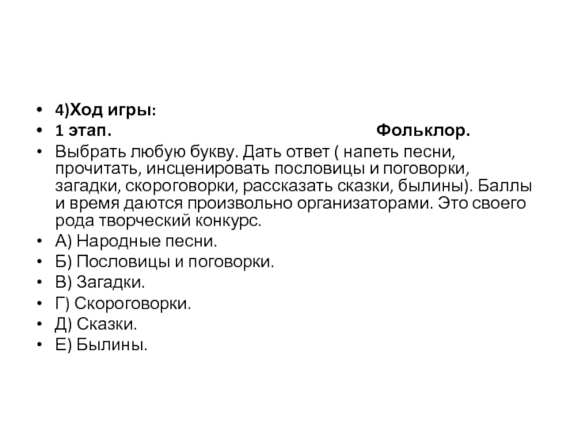 Выбрать любую букву. Дать ответ ( напеть песни, прочитать, инсценировать пословицы и поговорки, загадки, скороговорки, рассказать сказки, былины). Баллы и время даются произвольно организаторами. Это своего рода творческий конкурс.
