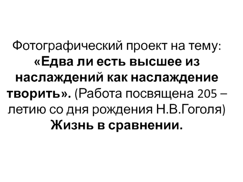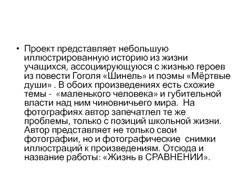 героев из повести Гоголя «Шинель» и поэмы «Мёртвые души» . В обоих произведениях есть схожие темы - «маленького человека» и губительной власти над ним чиновничьего мира. На фотографиях автор запечатлел те же проблемы, только с позиций школьной жизни. Автор представляет не только свои фотографии, но и фотографические снимки иллюстраций к произведениям. Отсюда и название работы: «Жизнь в СРАВНЕНИИ».