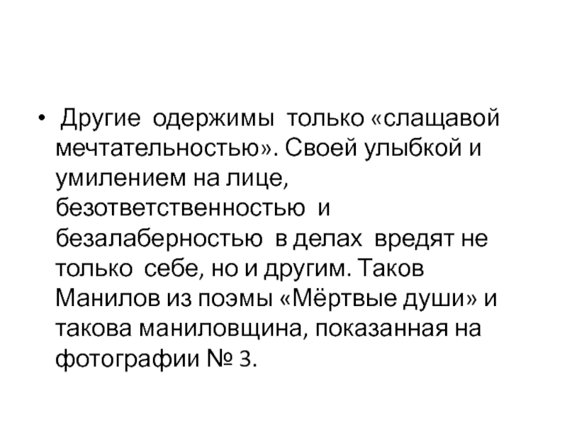 лице, безответственностью и безалаберностью в делах вредят не только себе, но и другим. Таков Манилов из поэмы «Мёртвые души» и такова маниловщина, показанная на фотографии № 3.
