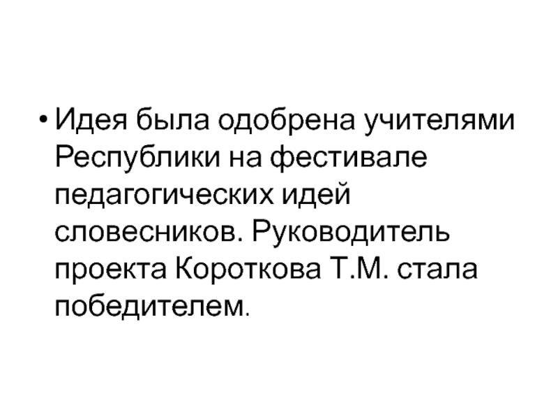 Слайд 35Идея была одобрена учителями Республики на фестивале педагогических идей словесников. Руководитель