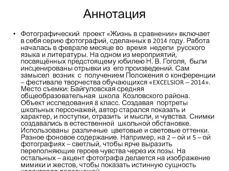 в 2014 году. Работа началась в феврале месяце во время недели русского языка и литературы. На одном из мероприятий, посвящённых предстоящему юбилею Н. В. Гоголя, были инсценированы отрывки из его произведений. Сам замысел возник с получением Положения о конференции – фестивале творчества обучающихся «EXCELSIOR – 2014». Место съемки: Байгуловская средняя общеобразовательная школа Козловского района. Объект исследования 8 класс. Создавая портреты школьных персонажей, автор старался показать и характер, и поступки, отразить и мысли, и чувства. Снимки создавались в естественной школьной обстановке. Использованы различные цветовые и световые оттенки. Разное фоновое содержание. Например, на 2 – ой и 5 – ой фотографиях – светлый, чтобы ярче выразить переполняющие героев чувства через их позы. На остальных – акцент фотографа делается на изображение мимики и жестов, чтобы показать истинную сущность характеров персонажей.
