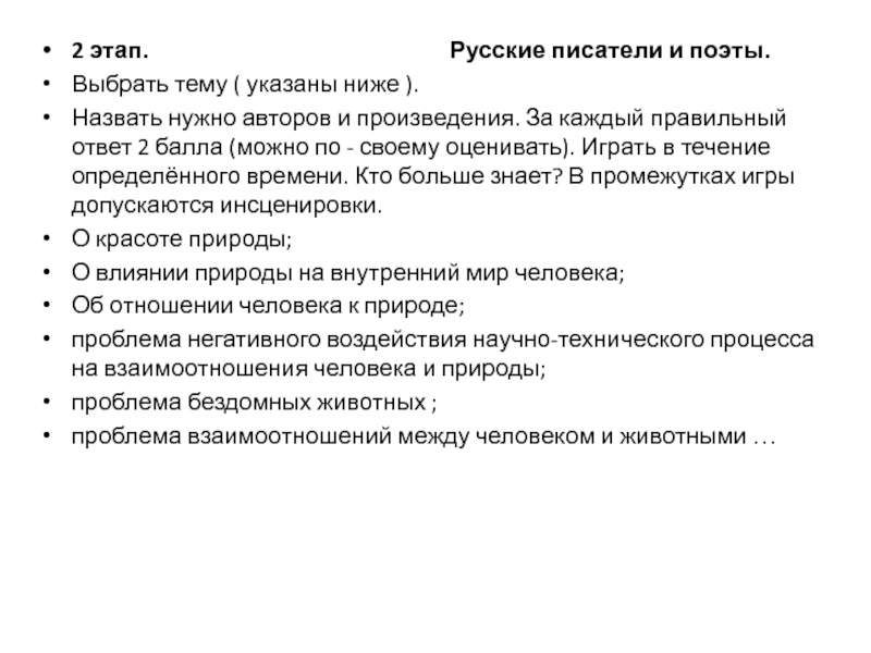 Назвать нужно авторов и произведения. За каждый правильный ответ 2 балла (можно по - своему оценивать). Играть в течение определённого времени. Кто больше знает? В промежутках игры допускаются инсценировки.