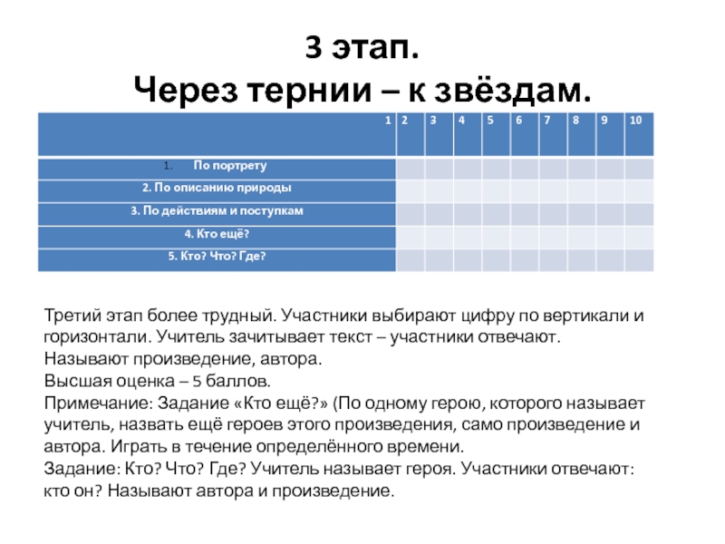 Третий этап более трудный. Участники выбирают цифру по вертикали и горизонтали. Учитель зачитывает текст – участники отвечают. Называют произведение, автора.