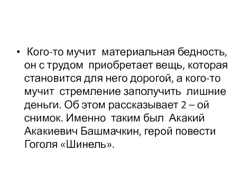 становится для него дорогой, а кого-то мучит стремление заполучить лишние деньги. Об этом рассказывает 2 – ой снимок. Именно таким был Акакий Акакиевич Башмачкин, герой повести Гоголя «Шинель».