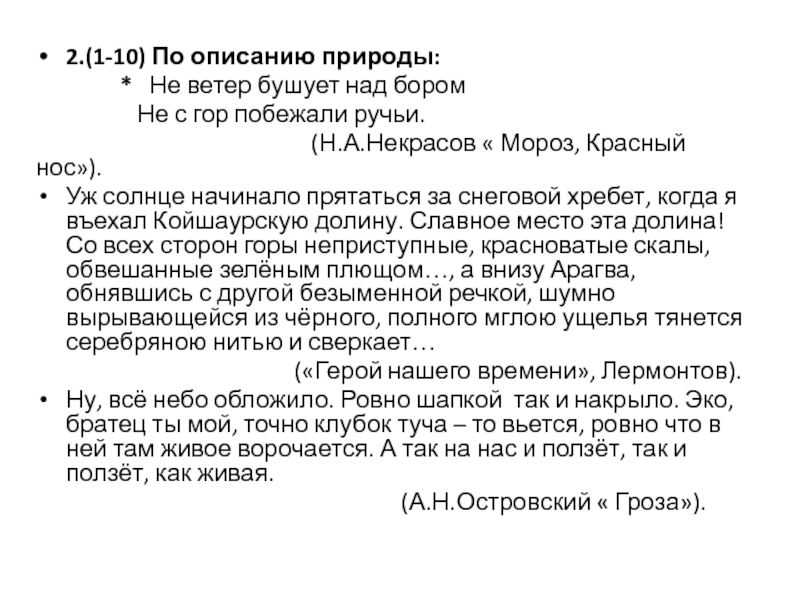 Уж солнце начинало прятаться за снеговой хребет, когда я въехал Койшаурскую долину. Славное место эта долина! Со всех сторон горы неприступные, красноватые скалы, обвешанные зелёным плющом…, а внизу Арагва, обнявшись с другой безыменной речкой, шумно вырывающейся из чёрного, полного мглою ущелья тянется серебряною нитью и сверкает…