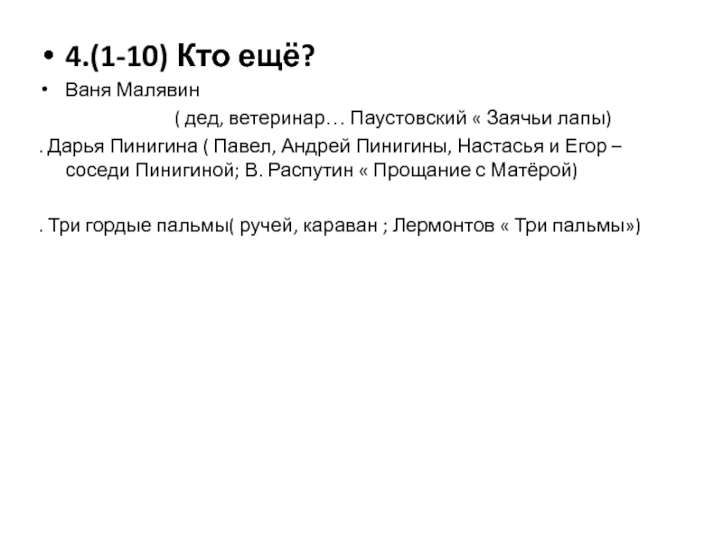 . Дарья Пинигина ( Павел, Андрей Пинигины, Настасья и Егор – соседи Пинигиной; В. Распутин « Прощание с Матёрой)