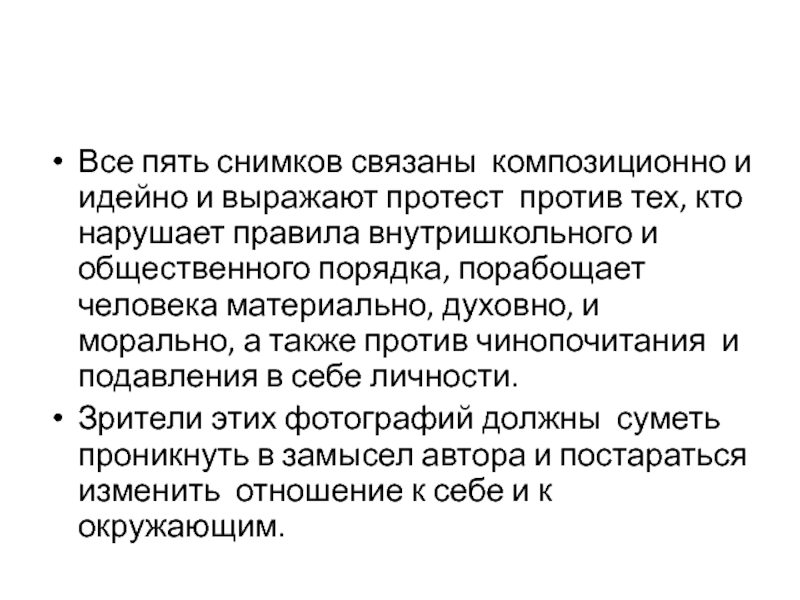 Слайд 30Все пять снимков связаны композиционно и идейно и выражают протест против