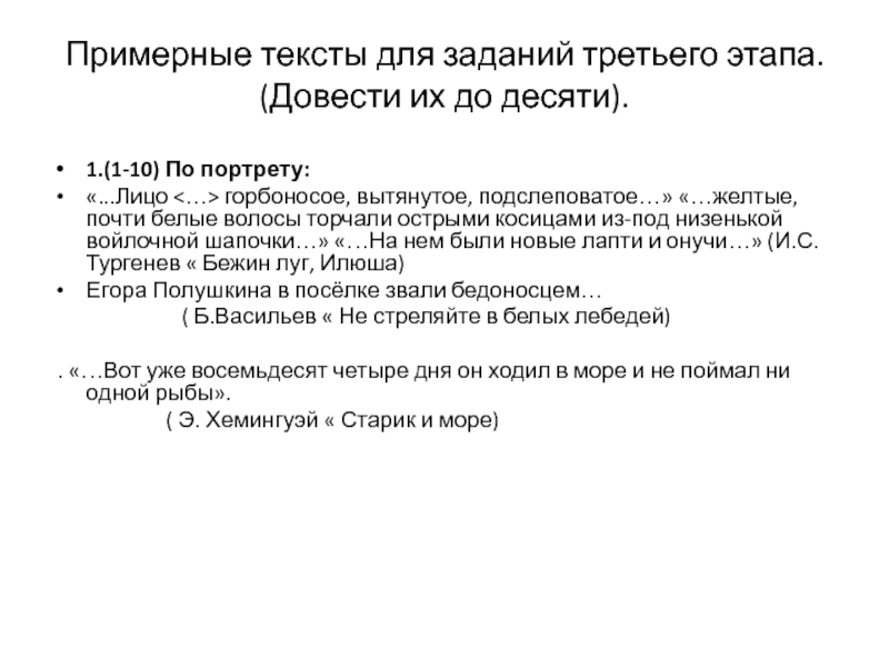<…> горбоносое, вытянутое, подслеповатое…» «…желтые, почти белые волосы торчали острыми косицами из-под низенькой войлочной шапочки…» «…На нем были новые лапти и онучи…» (И.С.Тургенев « Бежин луг, Илюша)