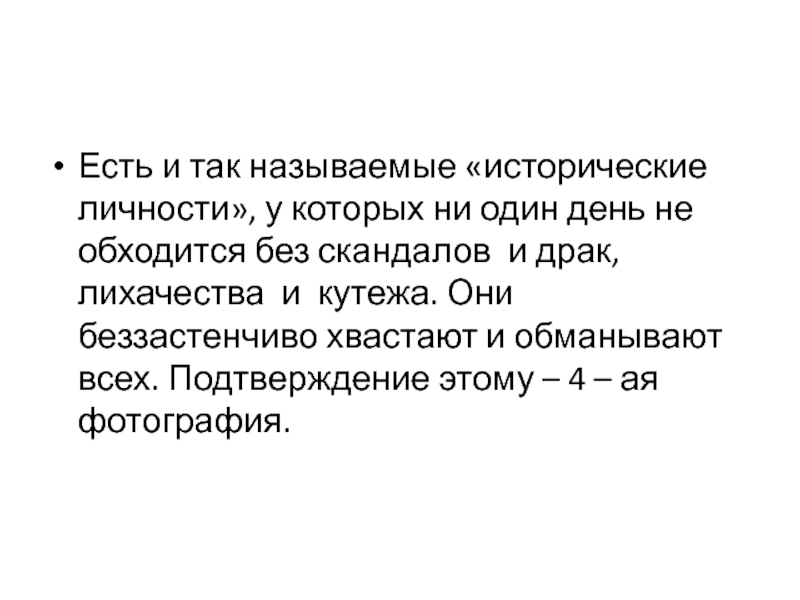 не обходится без скандалов и драк, лихачества и кутежа. Они беззастенчиво хвастают и обманывают всех. Подтверждение этому – 4 – ая фотография.