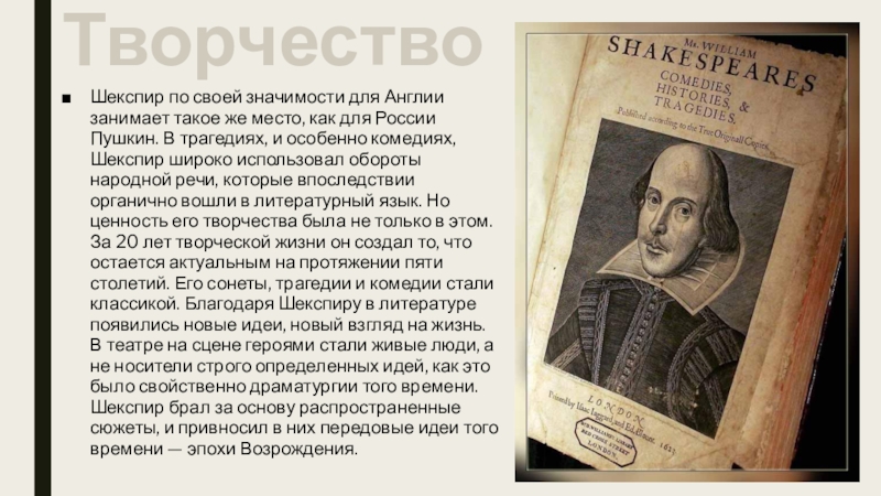 для России Пушкин. В трагедиях, и особенно комедиях, Шекспир широко использовал обороты народной речи, которые впоследствии органично вошли в литературный язык. Но ценность его творчества была не только в этом. За 20 лет творческой жизни он создал то, что остается актуальным на протяжении пяти столетий. Его сонеты, трагедии и комедии стали классикой. Благодаря Шекспиру в литературе появились новые идеи, новый взгляд на жизнь. В театре на сцене героями стали живые люди, а не носители строго определенных идей, как это было свойственно драматургии того времени. Шекспир брал за основу распространенные сюжеты, и привносил в них передовые идеи того времени — эпохи Возрождения.