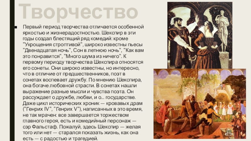 годы создал блестящий ряд комедий: кроме "Укрощения строптивой", широко известны пьесы "Двенадцатая ночь", Сон в летнюю ночь", "Как вам это понравится", "Много шума из ничего". К первому периоду творчества Шекспира относятся его сонеты. Они широко известны, но интересно, что в отличие от предшественников, поэт в сонетах воспевает дружбу. По мнению Шекспира, она богаче любовной страсти. В сонетах нашли выражение разные мысли и чувства поэта. Он рассуждает о дружбе, любви, и о... государстве. Даже цикл исторических хроник — кровавых драм ("Генрих IV", "Генрих V"), написанных в это время, не так мрачен: все завершается торжеством главного героя, есть и комедийный персонаж — сэр Фальстаф. Пожалуй, здесь Шекспир — желая того или нет — старался показать жизнь, как она есть — с радостью и трагедией.