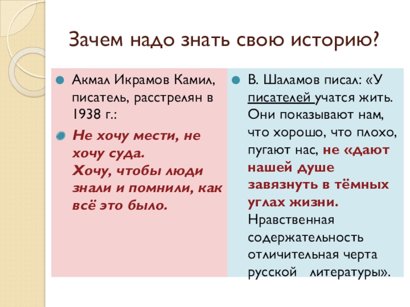 В. Шаламов писал: «У писателей учатся жить. Они показывают нам, что хорошо, что плохо, пугают нас, не «дают нашей душе завязнуть в тёмных углах жизни. Нравственная содержательность отличительная черта русской литературы».
