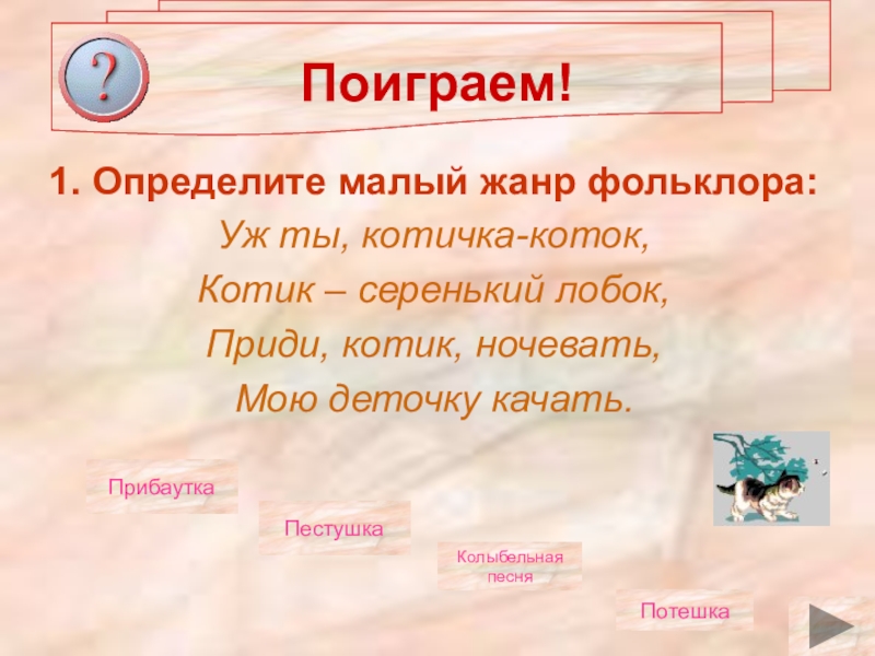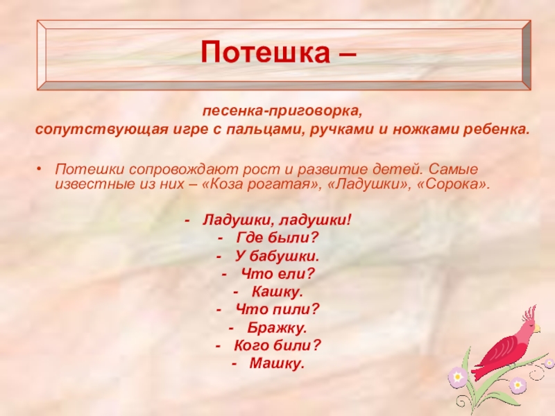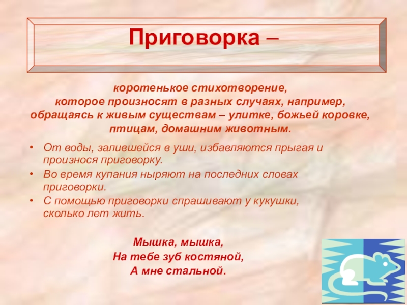 которое произносят в разных случаях, например, обращаясь к живым существам – улитке, божьей коровке, птицам, домашним животным.