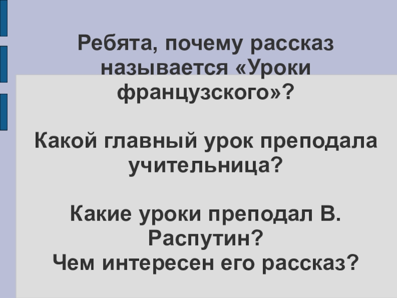Ребята, почему рассказ называется «Уроки французского»?  Какой главный урок преподала учительница?  Какие уроки преподал В.Распутин?