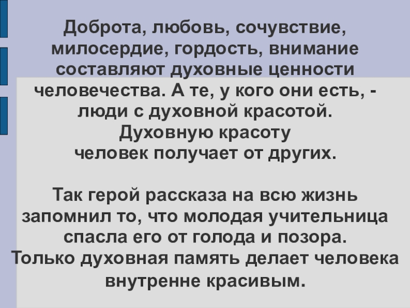 те, у кого они есть, - люди с духовной красотой. Духовную красоту человек получает от других. Так герой рассказа на всю жизнь запомнил то, что молодая учительница спасла его от голода и позора. Только духовная память делает человека внутренне красивым.