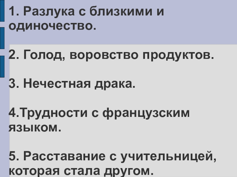 Слайд 41. Разлука с близкими и одиночество. 2. Голод, воровство продуктов. 3. Нечестная драка. 4.Трудности