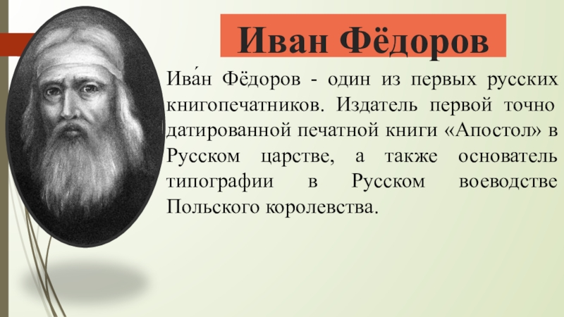 Иван ФёдоровИва́н Фёдоров - один из первых русских книгопечатников. Издатель первой точно датированной печатной книги «Апостол» в
