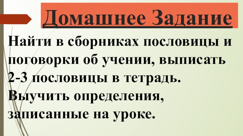 Домашнее ЗаданиеНайти в сборниках пословицы и поговорки об учении, выписать 2-3 пословицы в тетрадь. Выучить определения, записанные