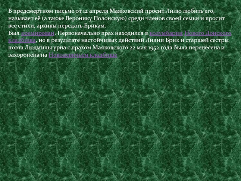 Слайд 15В предсмертном письме от 12 апреля Маяковский просит Лилю любить его,