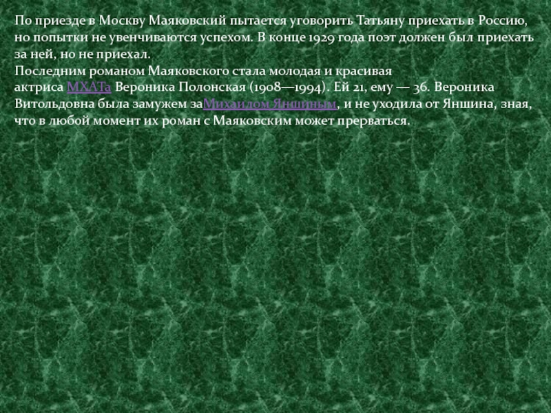 Слайд 13По приезде в Москву Маяковский пытается уговорить Татьяну приехать в Россию,