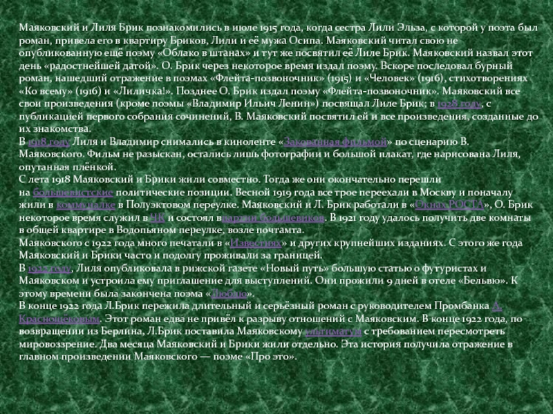 Слайд 11Маяковский и Лиля Брик познакомились в июле 1915 года, когда сестра