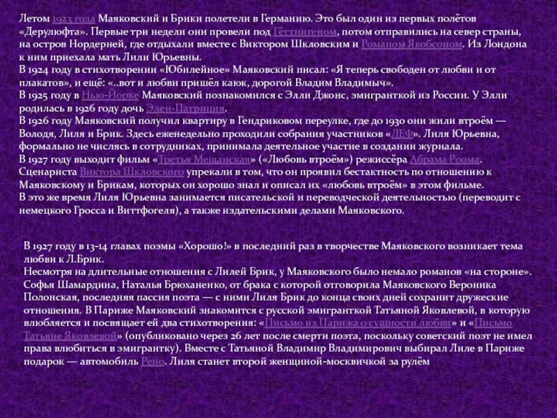 Слайд 12Летом 1923 года Маяковский и Брики полетели в Германию. Это был один из