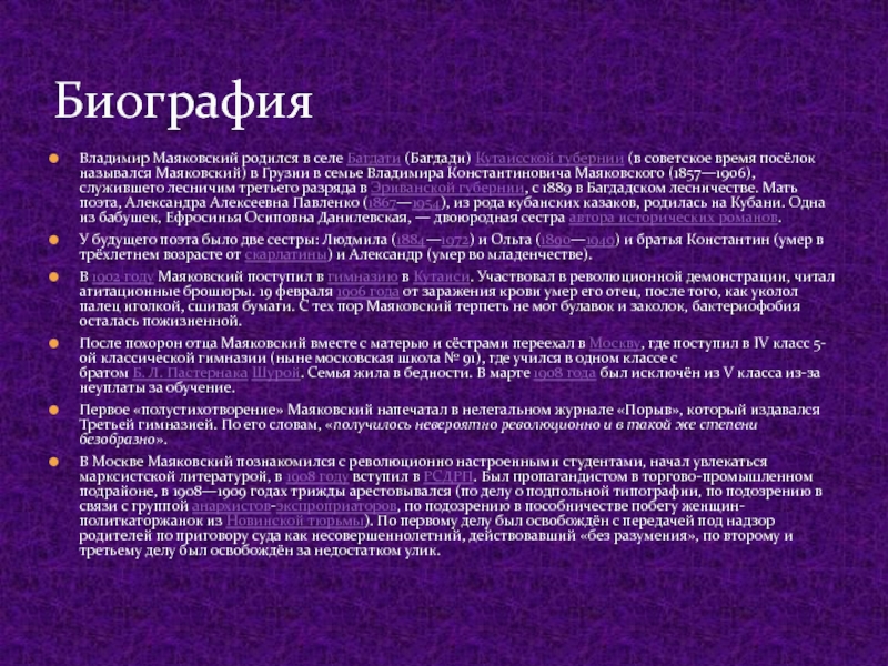 Слайд 2Владимир Маяковский родился в селе Багдати (Багдади) Кутаисской губернии (в советское время посёлок назывался Маяковский)