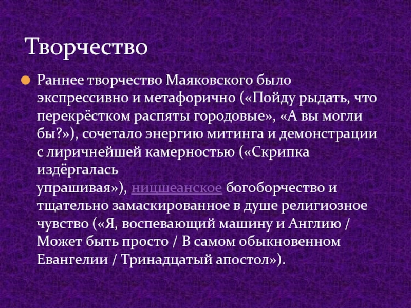 распяты городовые», «А вы могли бы?»), сочетало энергию митинга и демонстрации с лиричнейшей камерностью («Скрипка издёргалась упрашивая»), ницшеанское богоборчество и тщательно замаскированное в душе религиозное чувство («Я, воспевающий машину и Англию / Может быть просто / В самом обыкновенном Евангелии / Тринадцатый апостол»).