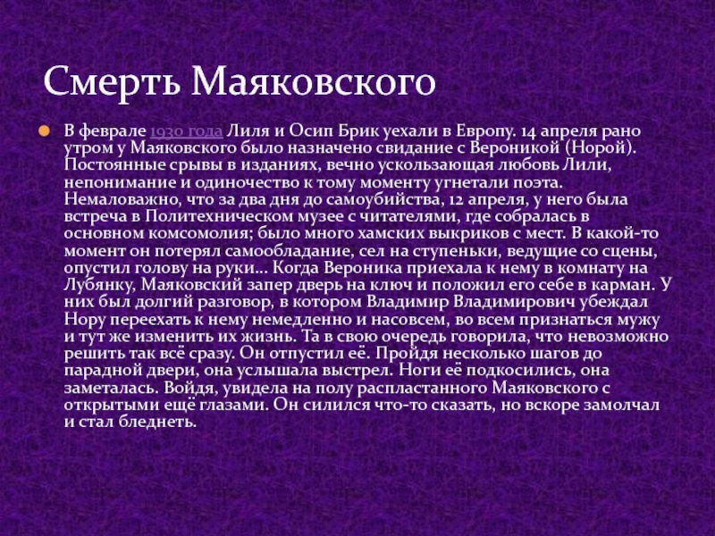 В 1924 году в стихотворении «Юбилейное» Маяковский писал: «Я теперь свободен от любви и от плакатов», и ещё: «..вот и любви пришёл каюк, дорогой Владим Владимыч».