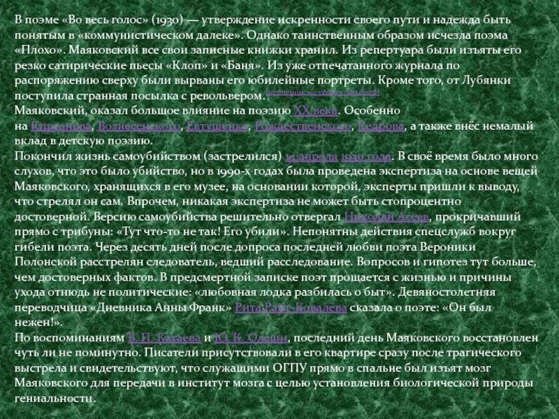 надежда быть понятым в «коммунистическом далеке». Однако таинственным образом исчезла поэма «Плохо». Маяковский все свои записные книжки хранил. Из репертуара были изъяты его резко сатирические пьесы «Клоп» и «Баня». Из уже отпечатанного журнала по распоряжению сверху были вырваны его юбилейные портреты. Кроме того, от Лубянки поступила странная посылка с револьвером.[источник не указан 709 дней]