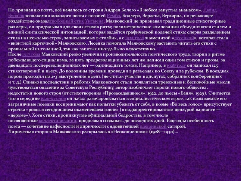 запустил ананасом». Давид Бурлюкпознакомил молодого поэта с поэзией Рембо, Бодлера, Верлена, Верхарна, но решающее воздействие оказалсвободный стих Уитмена. Маяковский не признавал традиционные стихотворные размеры, он придумывал для своих стихов ритм; полиметрические композиции объединяются стилем и единой синтаксической интонацией, которая задаётся графической подачей стиха: сперва разделением стиха на несколько строк, записываемых в столбик, а с 1923 года знаменитой «лесенкой», которая стала «визитной карточкой» Маяковского. Лесенка помогала Маяковскому заставить читать его стихи с правильной интонацией, так как запятых иногда было недостаточно.