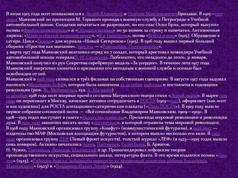 Слайд 6В июле 1915 года поэт познакомился с Лилей Юрьевной и Осипом МаксимовичемБриками. В 1915—1917