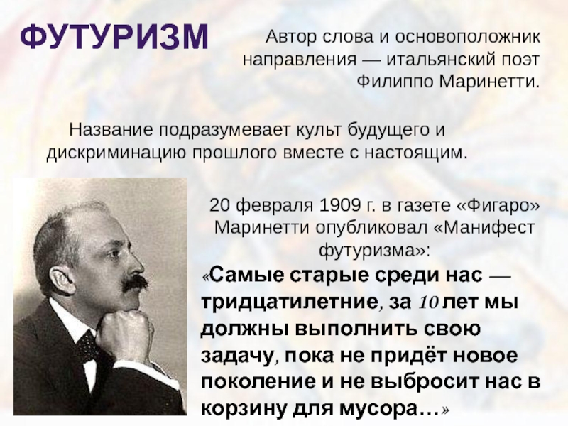 Автор слова и основоположник направления — итальянский поэт Филиппо Маринетти.