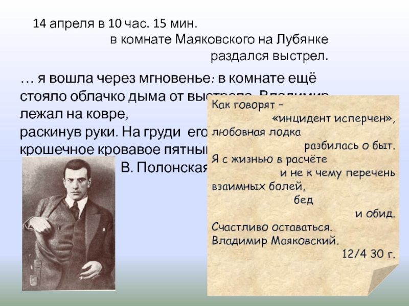 … я вошла через мгновенье: в комнате ещё стояло облачко дыма от выстрела. Владимир лежал на ковре,