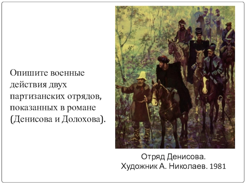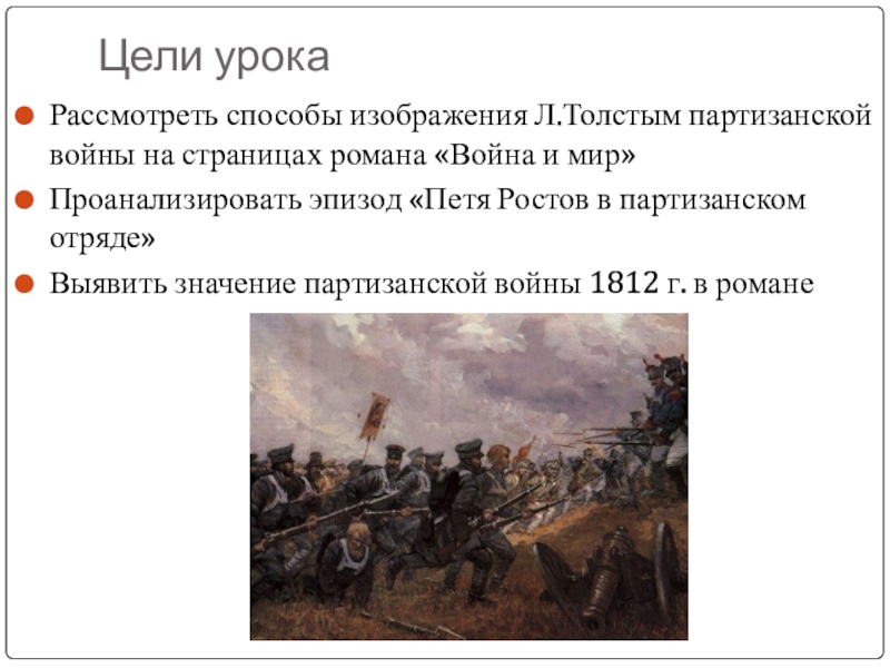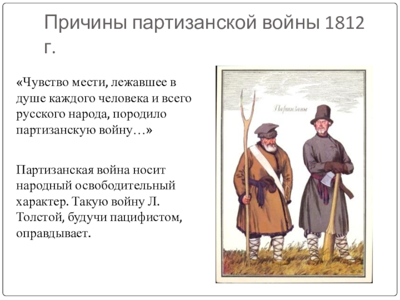 Партизанская война носит народный освободительный характер. Такую войну Л.Толстой, будучи пацифистом, оправдывает.