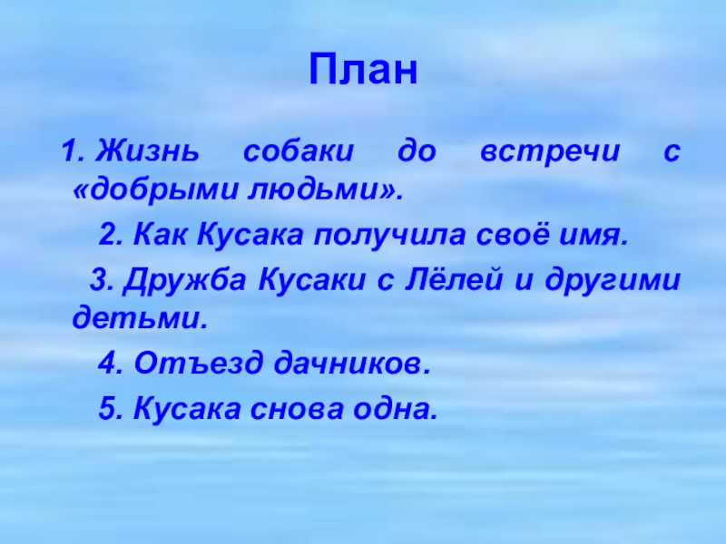 План  1. Жизнь собаки до встречи с «добрыми людьми».      2. Как Кусака получила своё имя.     3. Дружба Кусаки с Лёлей и другими детьми.      4. Отъезд