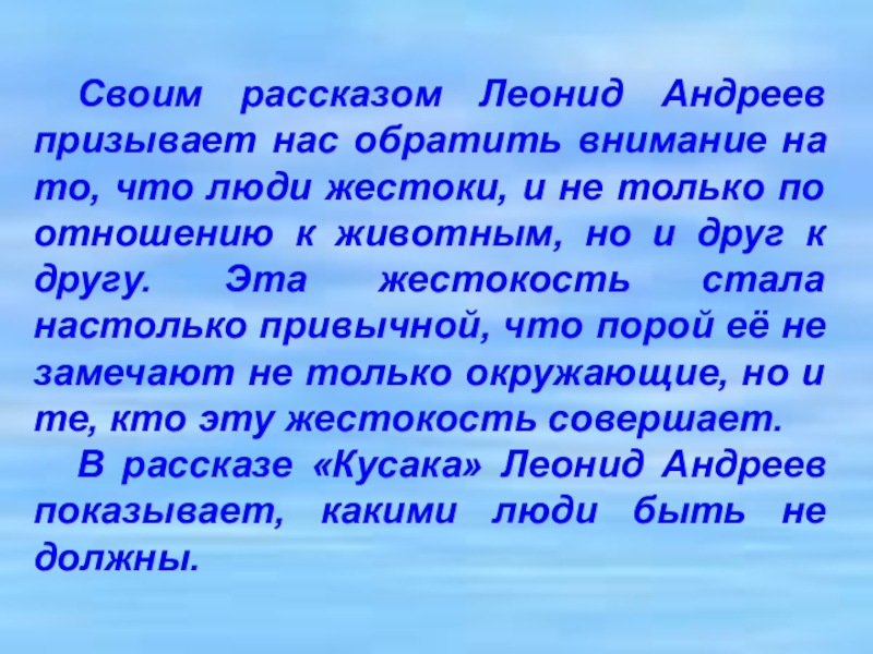 Своим рассказом Леонид Андреев призывает нас обратить внимание на то, что люди жестоки, и не