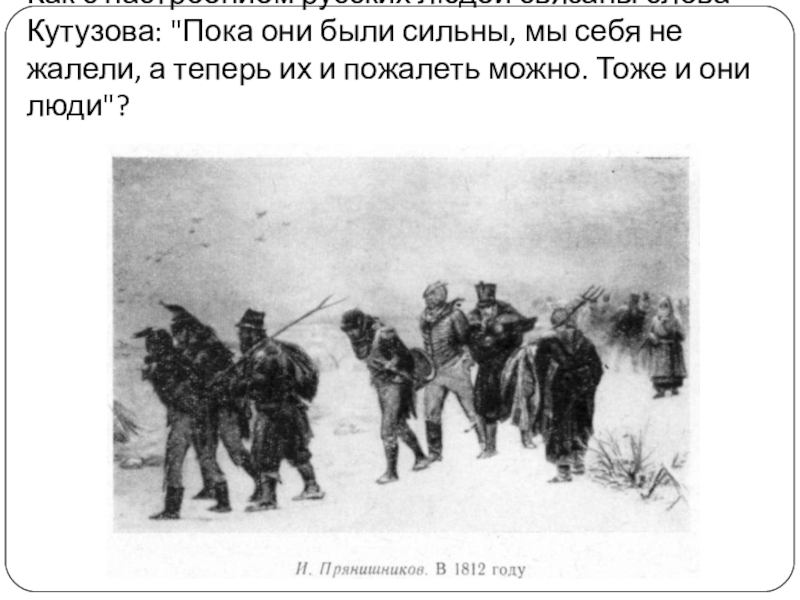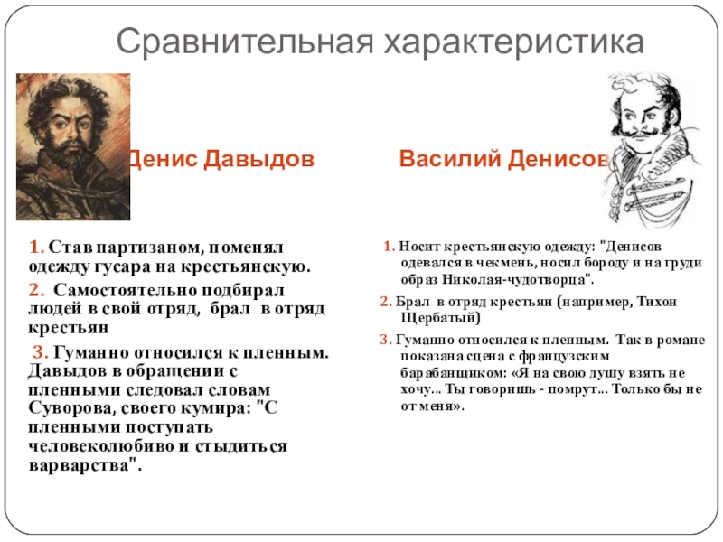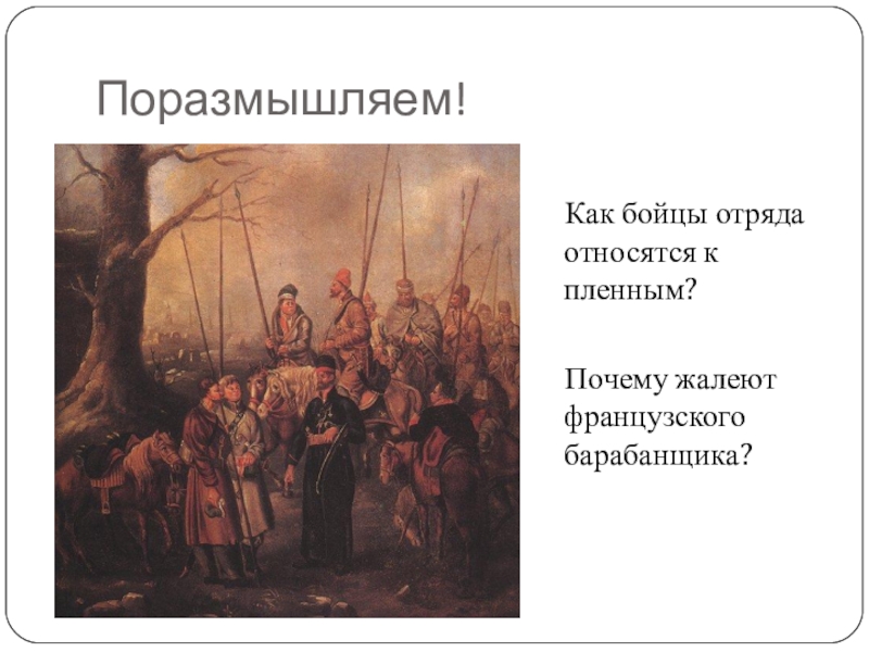 3. Гуманно относился к пленным. Так в романе показана сцена с французским барабанщиком: «Я на свою душу взять не хочу... Ты говоришь - помрут... Только бы не от меня».
